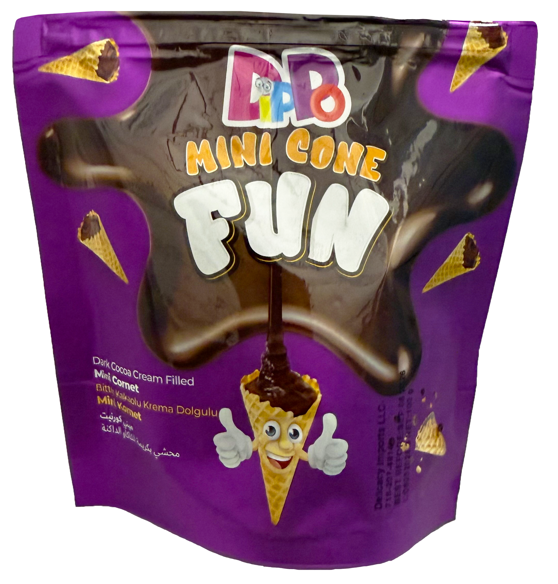 Indulge in a deliciously bold snack with Dippo Dark Chocolate Mini Cones! Each crunchy mini biscuit cone is generously filled with smooth dark chocolate cream, offering a perfect balance of texture and flavor.